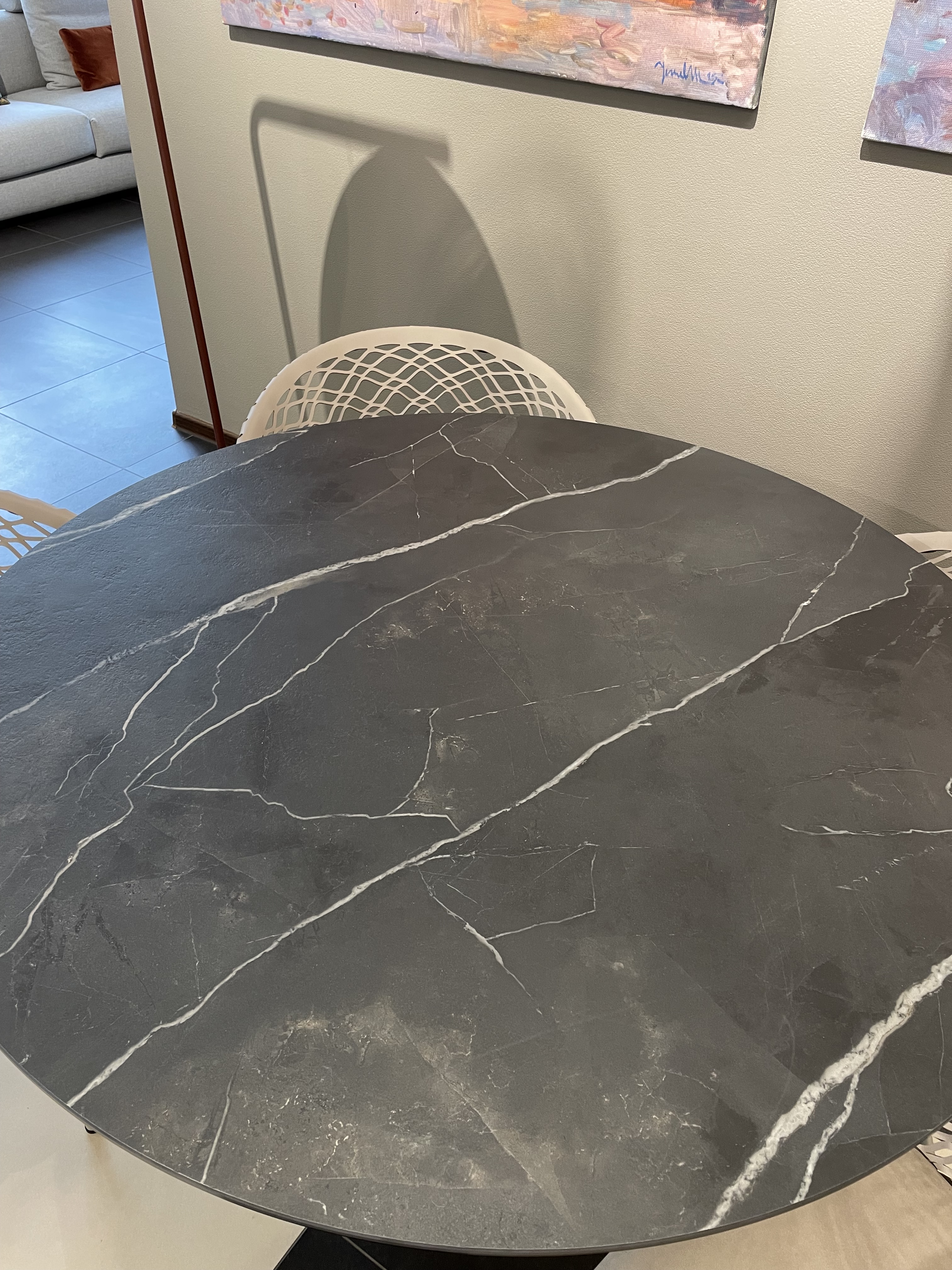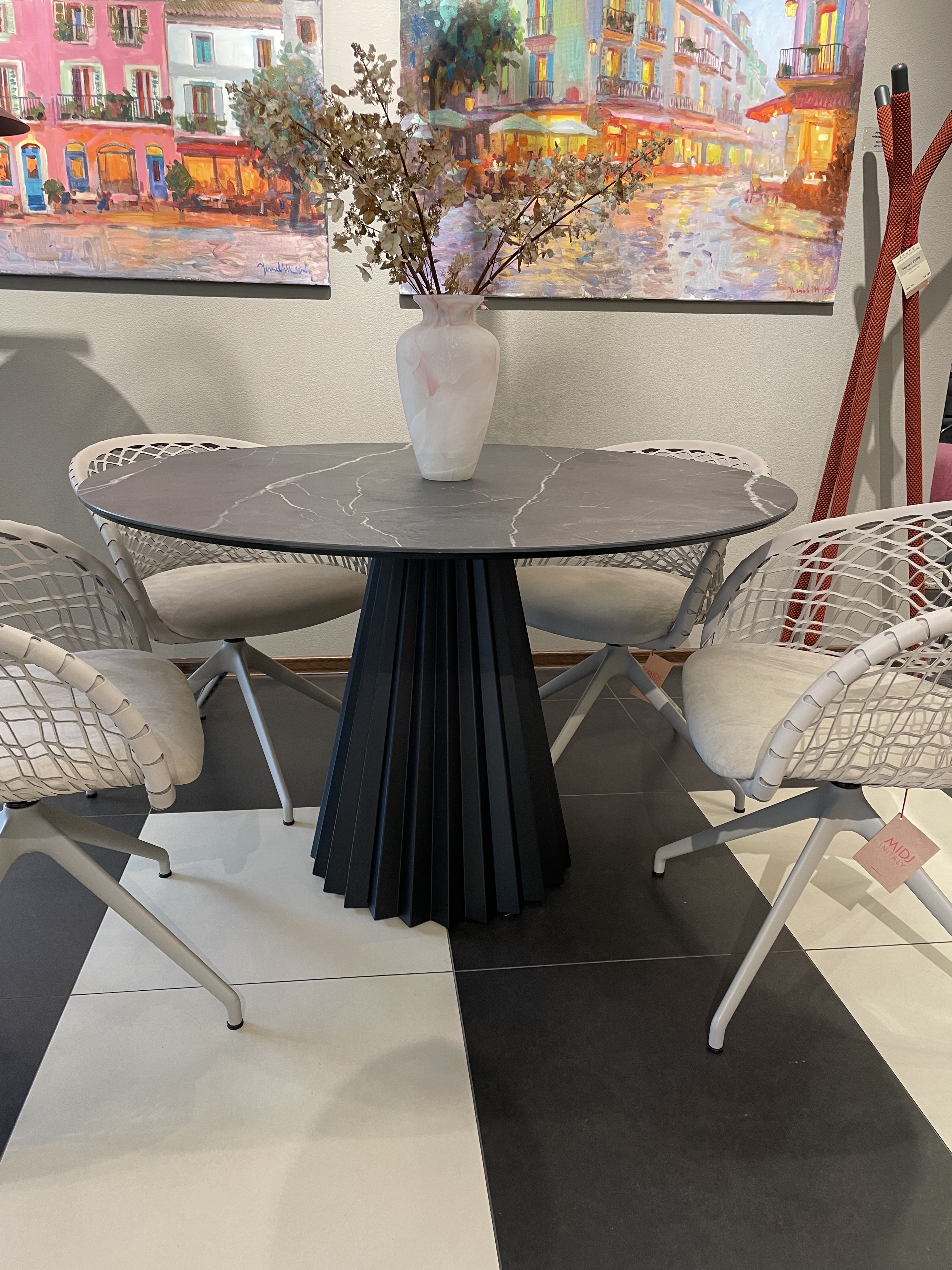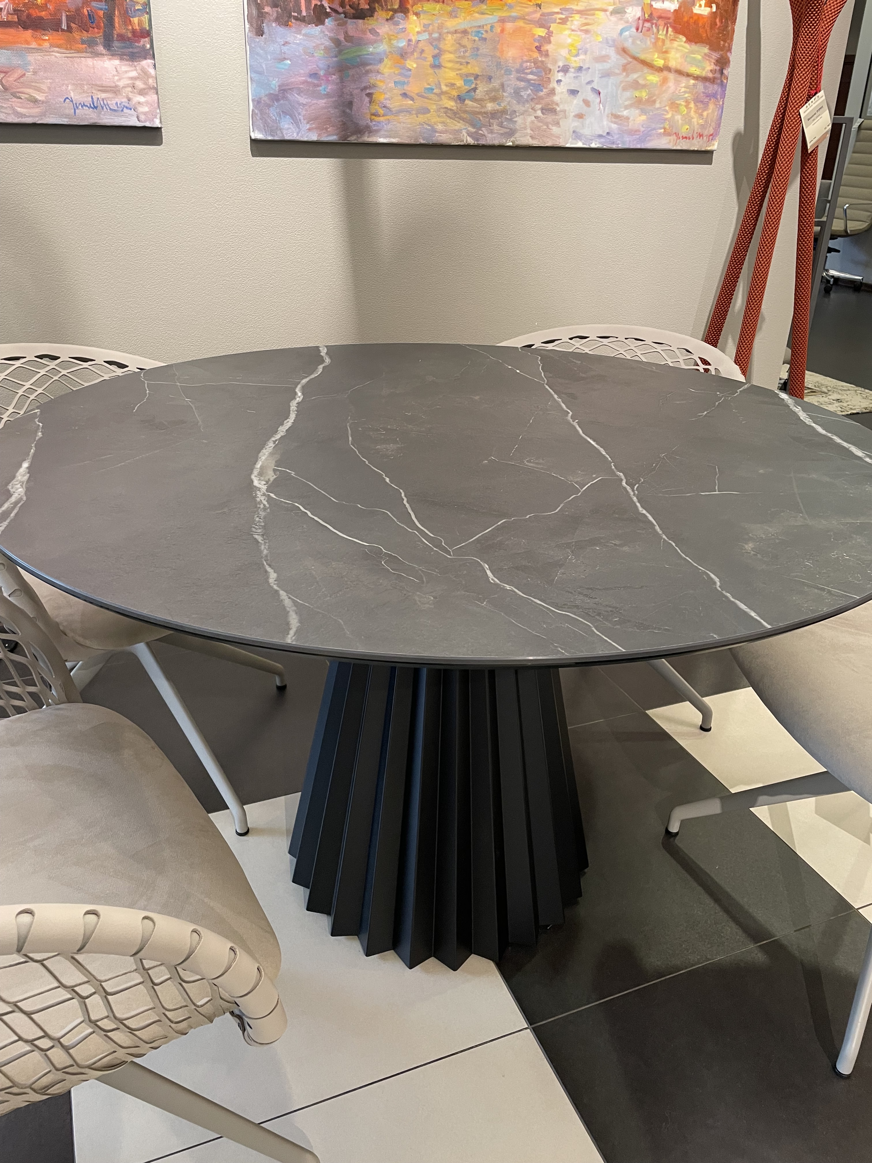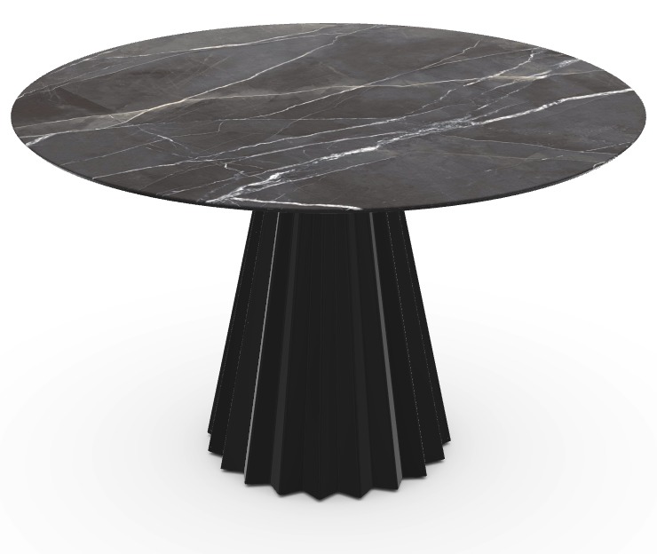 PLISSE – оригинальный стол с центральной опорой из металла. Круглая столешница выполнена из кристаллокерамики.