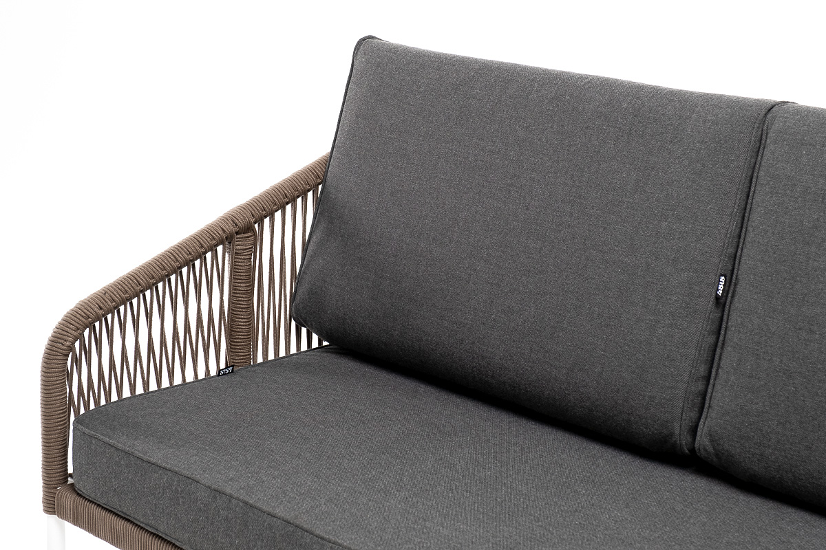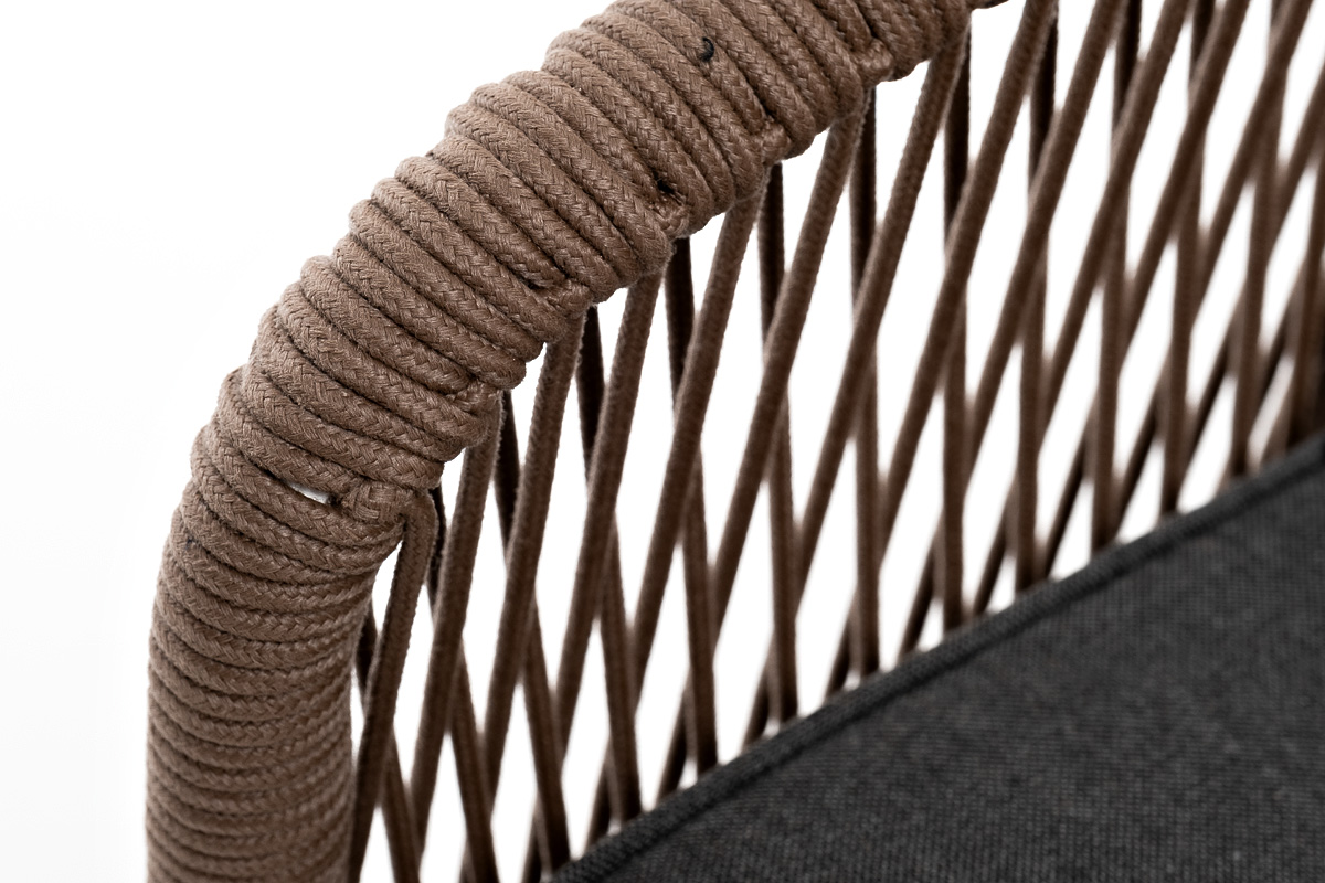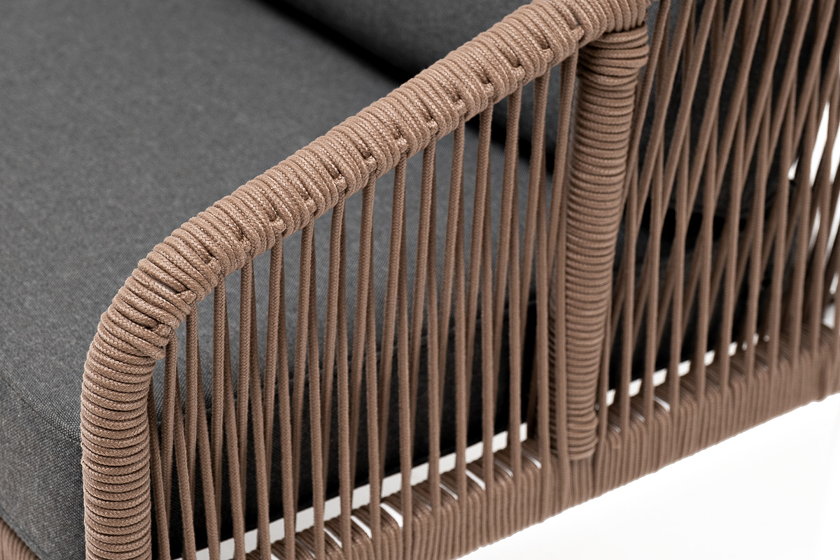 Каркас дивана изготовлен из прочного алюминия и окрашен порошковой краской в белый цвет. Боковины каркаса оплетены роупом - эластичными синтетическими лентами коричневого цвета, изготовленными из высокопрочных полиэфирных волокон. Такое плетение не только придает дивану особую изысканность, но и увеличивает срок его службы.