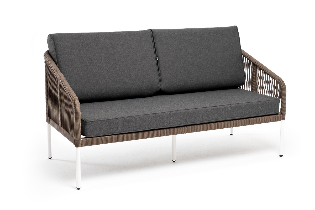 "Канны" диван 2-местный плетеный из роупа, каркас алюминий белый, роуп коричневый круглый, ткань серая