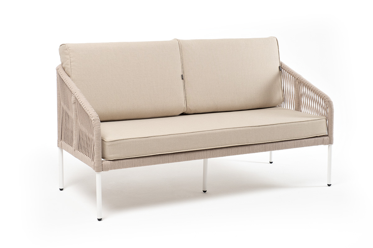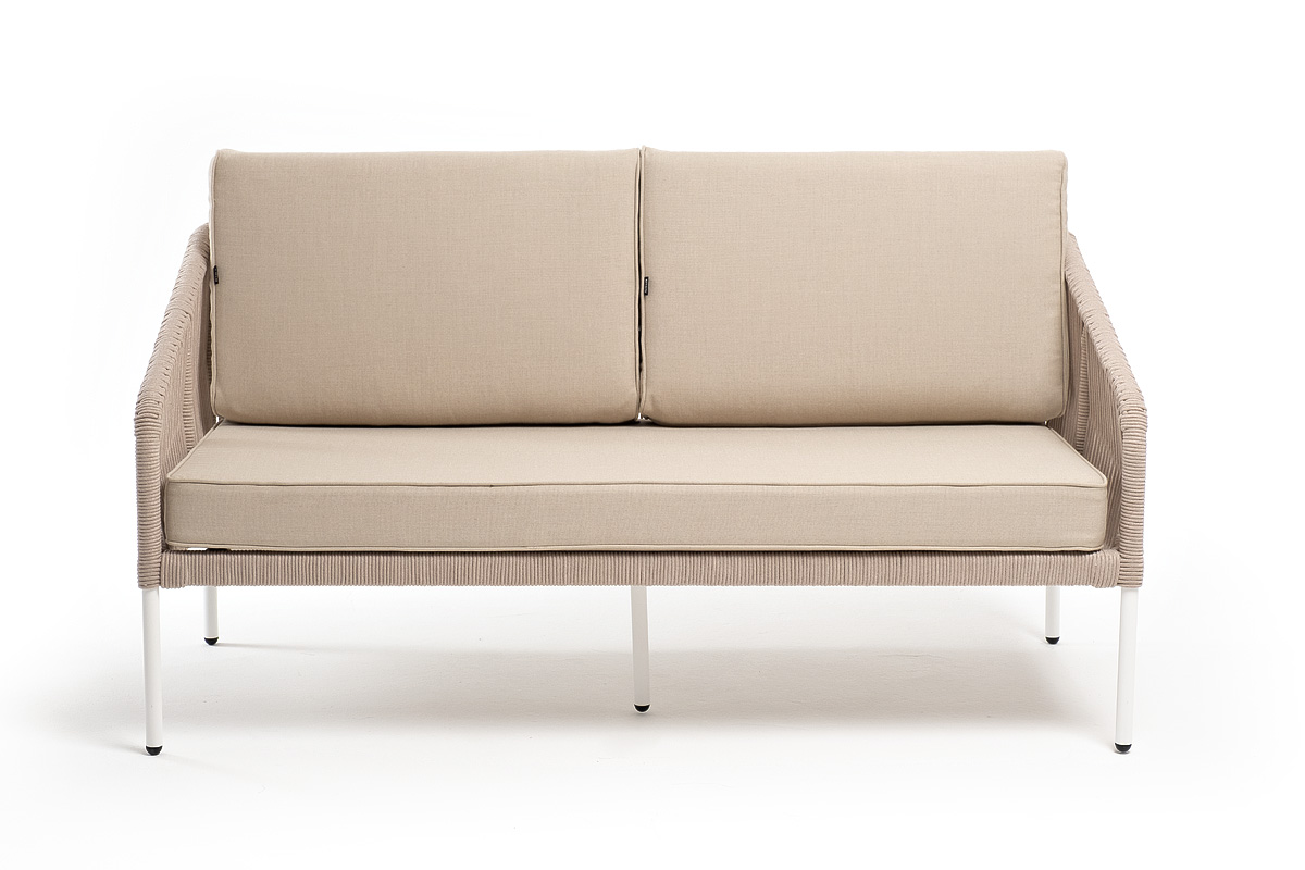 "Канны" диван 2-местный плетеный из роупа, каркас алюминий белый муар, роуп бежевый круглый, ткань бежевая 052