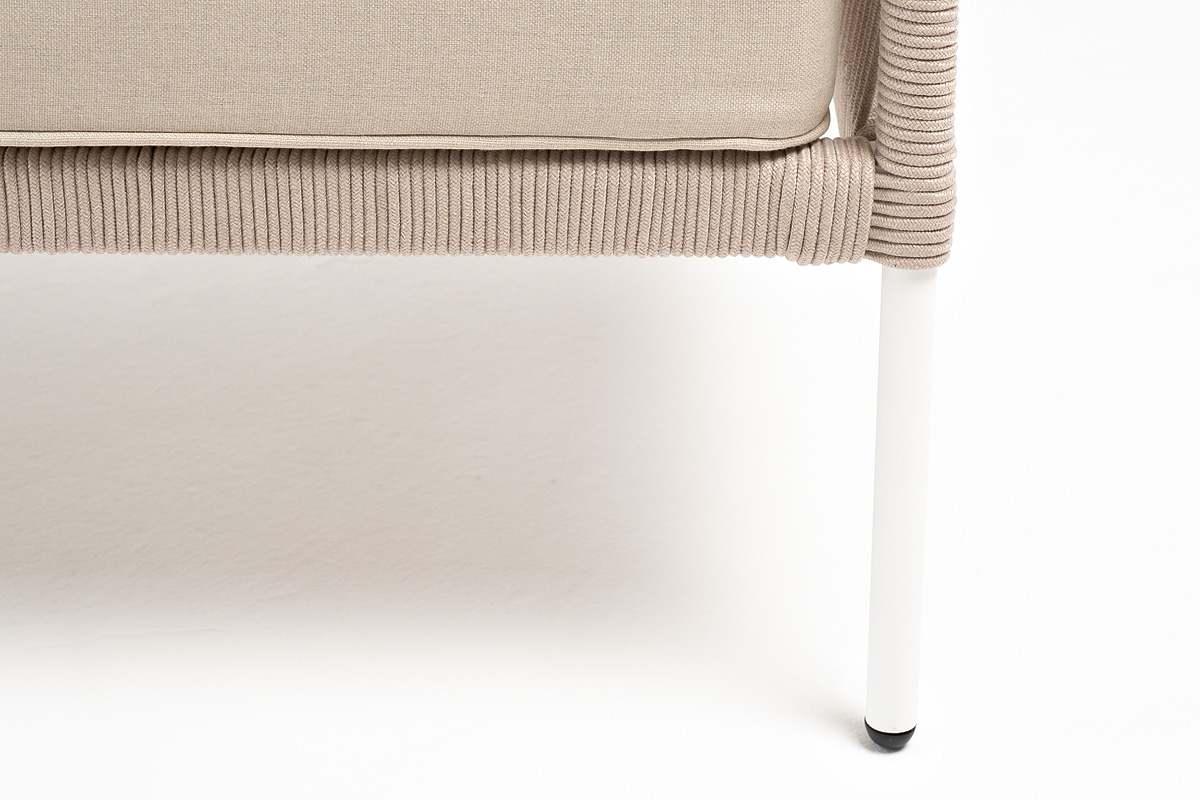 Диван имеет алюминиевый каркас, окрашенный порошковой краской в белый цвет. Боковины каркаса вручную оплетены роупом - эластичными синтетическими лентами, изготовленными из высокопрочных полиэфирных волокон бежевого цвета.