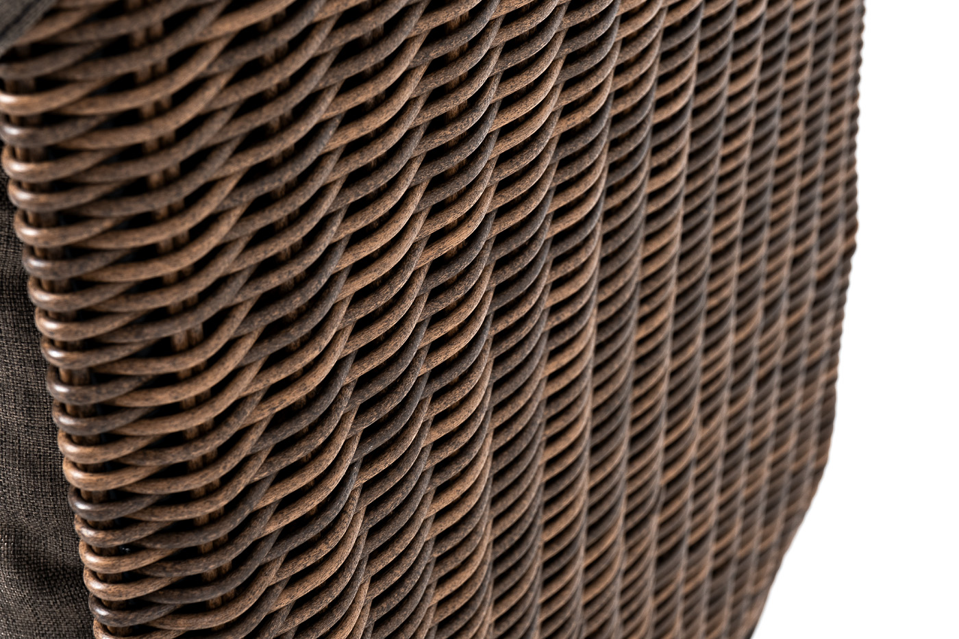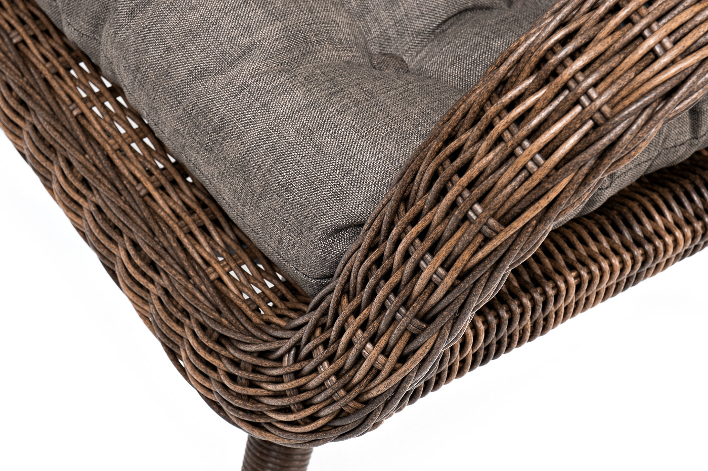 Садовое кресло дополнено мягкими подушками для комфортного размещения. Они выполнены в серо-коричневом цвете. При их пошиве используется полиэстер с плотностью 230гр/м2. Влагоотталкивающая пропитка усиливает защитные свойства материала.