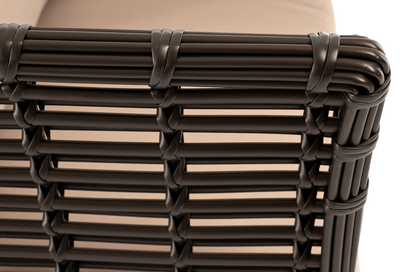 Кресло оснащено каркасом из прочного алюминия, ручное круглое плетение является основным декоративным элементом мебели. Оно выполнено из искусственного ротанга в бронзовом цвете.