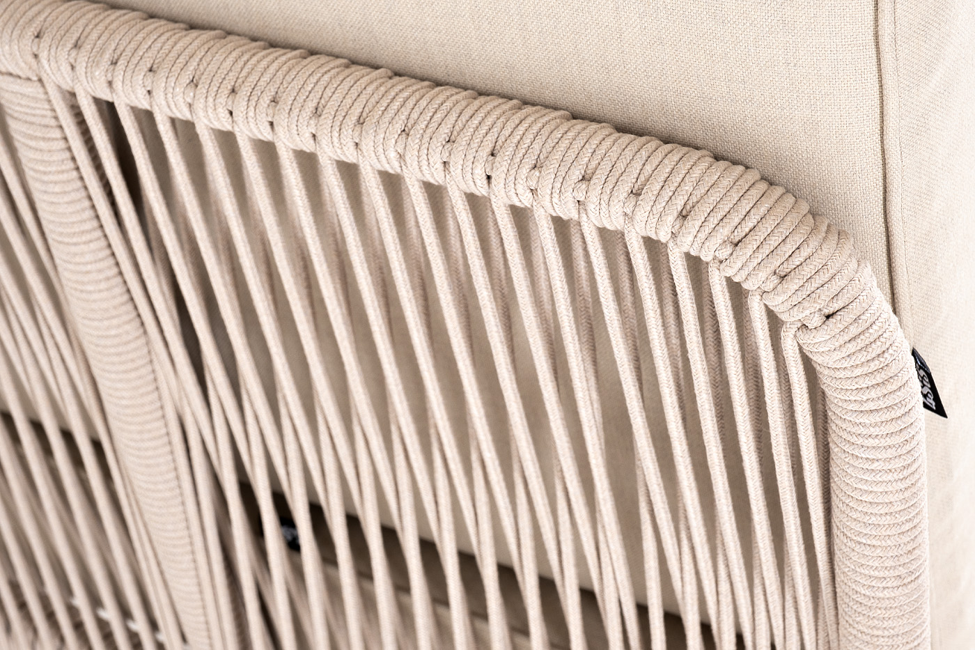 "Канны" угловой модуль плетеный из роупа, основание дуб, роуп бежевый круглый, ткань бежевая 052