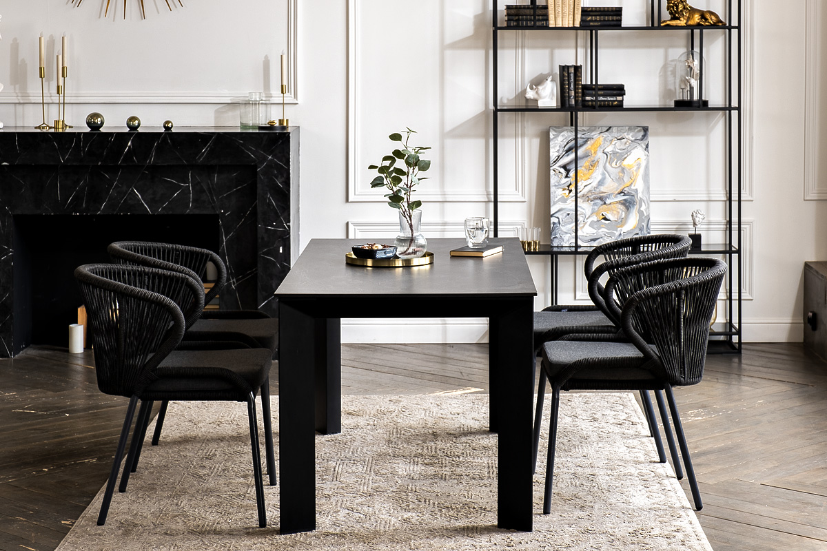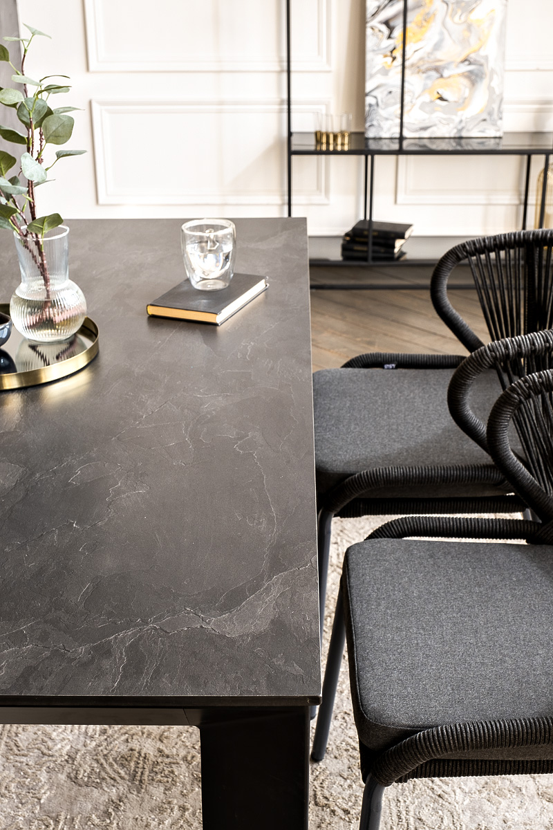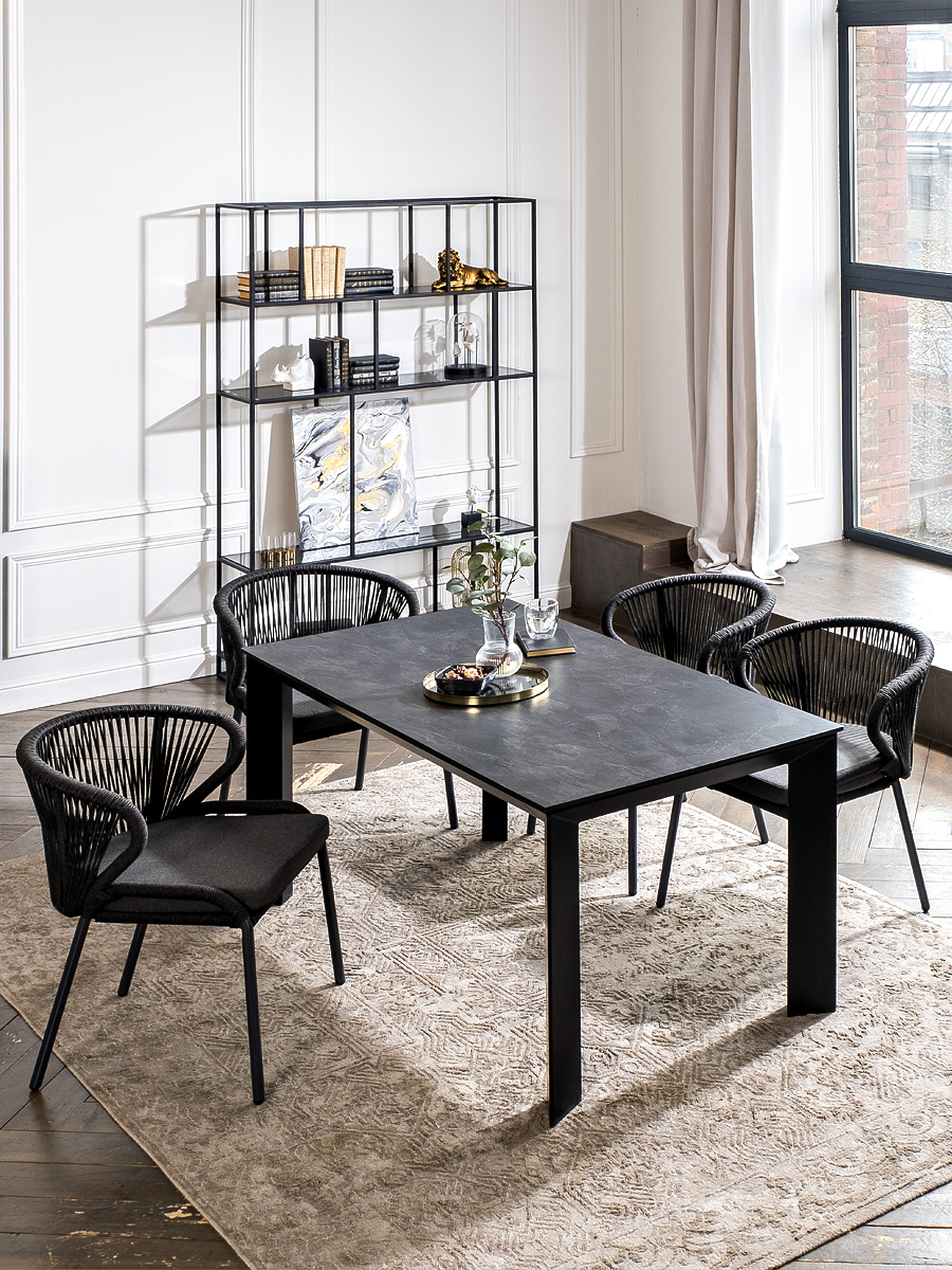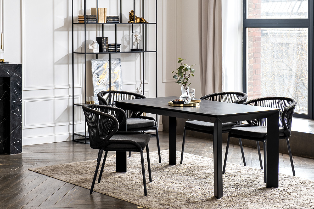 Стулья «Милан» выполнены из роупа темно-серого цвета, который гармонируют с общим дизайном комплекта. Размер каждого стула составляет 570×660×795 мм. Каркас из алюминия придает стульям легкость и прочность, а порошковое окрашивание защищает металл от коррозии и увеличивает срок службы мебели.