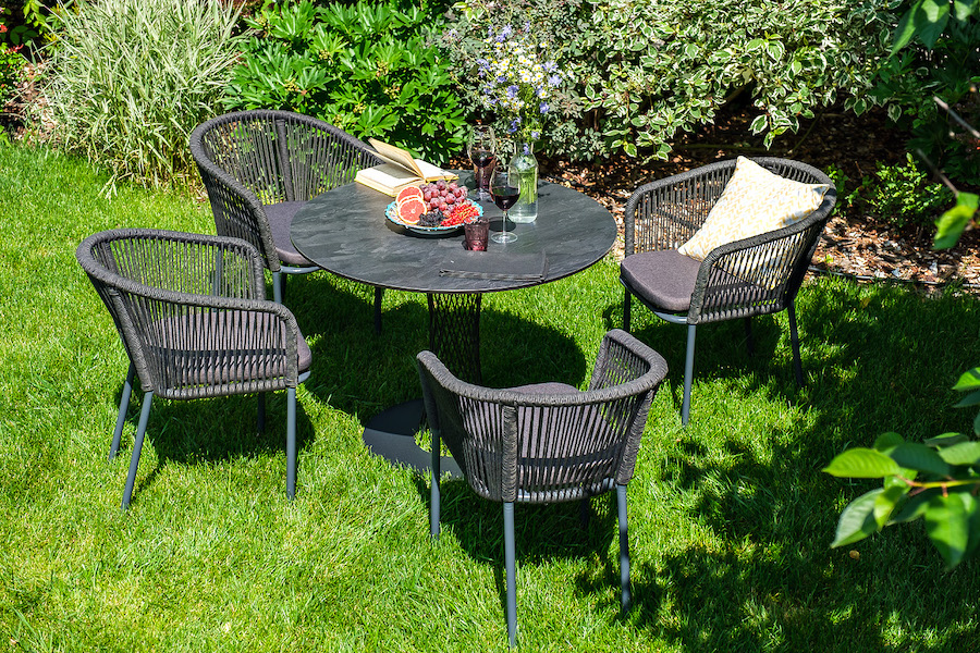 4 кресла из коллекции «Марсель», выполненных из алюминиевого каркаса и ручной оплетки роупом. Это эластичные синтетические ленты из высокопрочных полиэфирных волокон, представлены в темно-сером цвете.