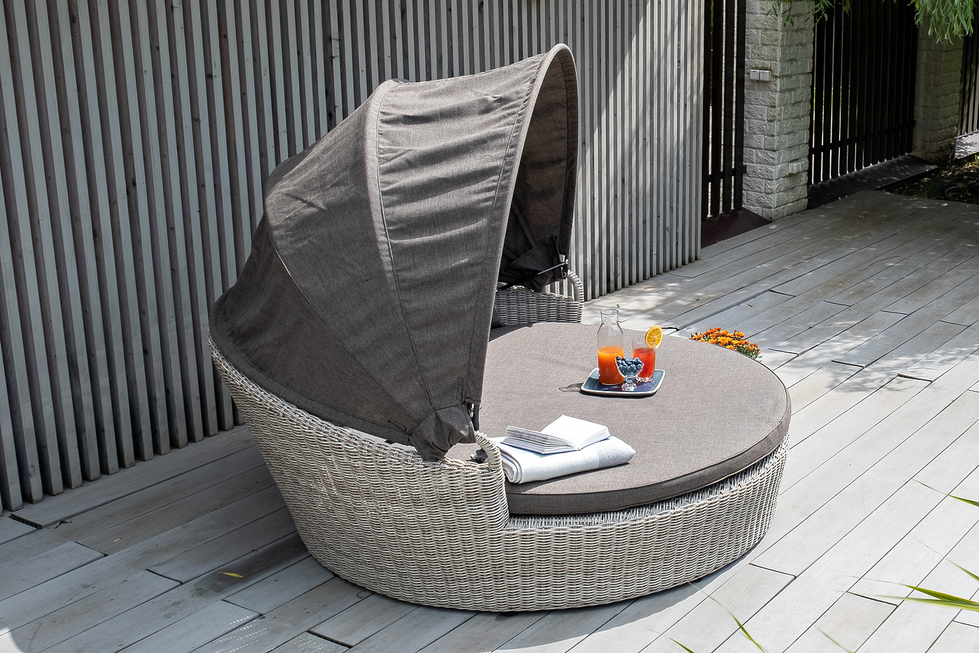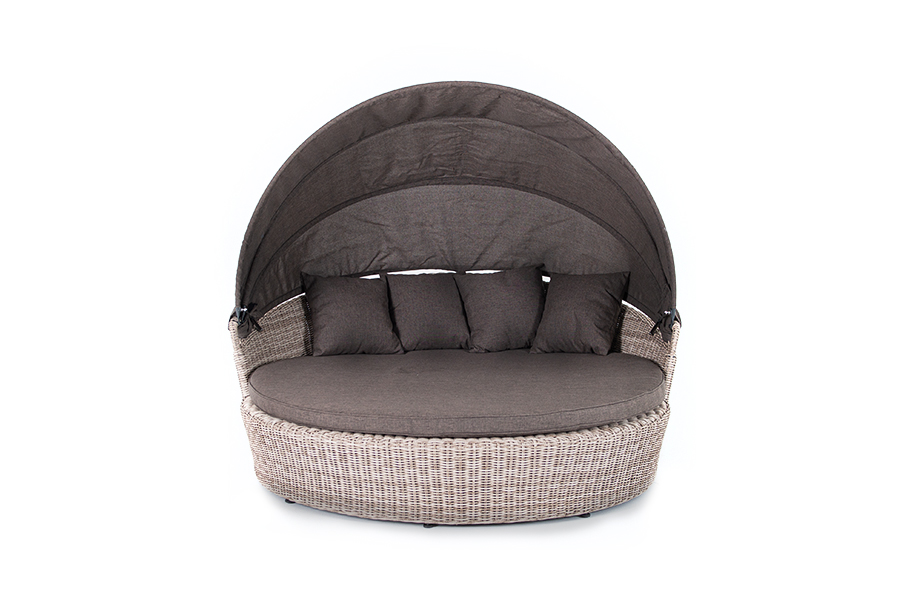 Данная модель имеет в основании прочный алюминиевый каркас, оплетенный вручную круглым ротангом светло-серого цвета и оснащена регулируемым козырьком, который ограничивает попадание солнечных лучей. Выполнен из водостойкой полиэфирной ткани.